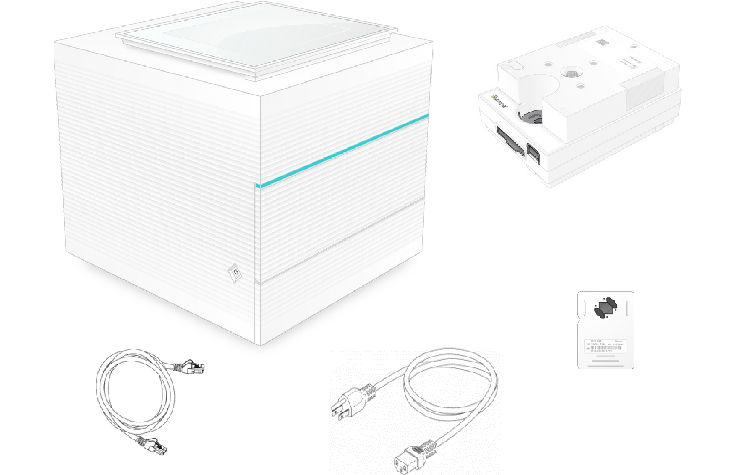 • Shipping box includes Ethernet cable, power cord, dry test cartridge, and dry test flow cell