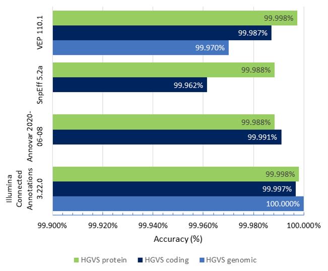Overall, Illumina Connected Annotations exhibits high accuracy rates across all categories for HGVS notations.