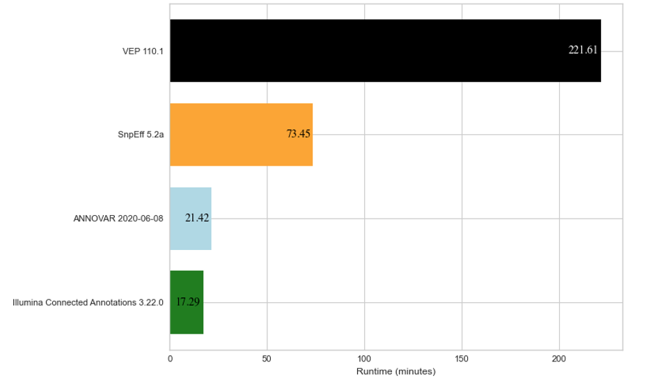 Figure 2: Average run time results for annotation of about 6.5 million DNA variants across three replicates for four different annotation algorithms.