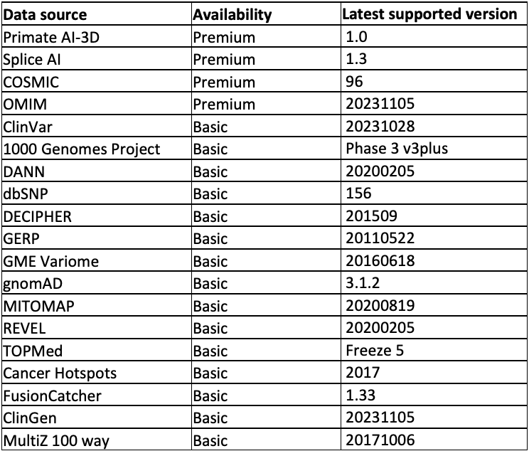 The data sources supported are listed in Table 1 and divided into two tiers: Premium and Basic. The Basic tier can be accessed free of charge. The Premium tier requires a license. For access, please contact annotation_support@illumina.com.