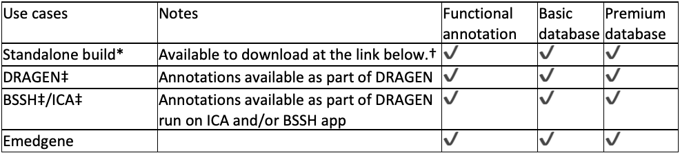 Table 2: Deployment models of Illumina Connected Annotations—*To obtain a license for the Premium database, email annotation_support@illumina.com. †Download the standalone build here. ‡Available in DRAGEN version 4.3.