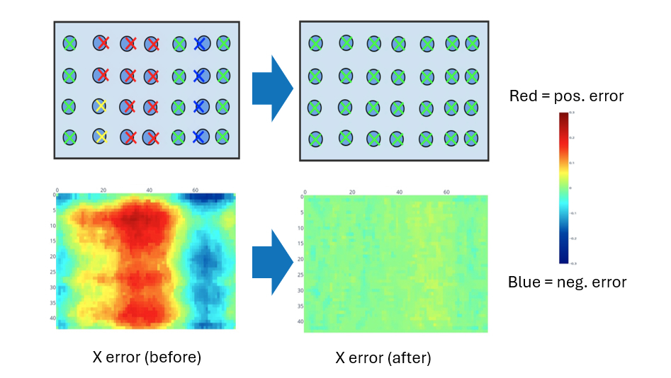 In addition to recipe improvements, NovaSeq X software update 1.3 includes image processing algorithm improvements that are critical to Illumina’s pursuit of higher data quality. On high-throughput flow cells, the alignment of image pixels to well locations in the patterned flow cell is particularly challenging, since well location estimation can be affected by jitter and distortion. While jitter is usually caused by unintended camera movement, instrument vibration, or image repositioning, distortion is induced by the geometry of the camera lens. In software update 1.3, a novel approach has been implemented that shows superior performance in pixel-to-well location synchronization by eliminating spatial errors on the flow cell. The improvement is highlighted in Figure 1. Circles show the actual location of a cluster within a well, while X marks indicate the estimated position. The heat map shows the spatial error in the x-(or horizontal) direction on a section of the flow cell, with a significant reduction observed after the software 1.3 algorithm is applied.