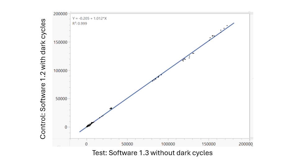 Figure 10: High TPM concordance: software 1.2 with dark cycles versus software 1.3 without dark cycles