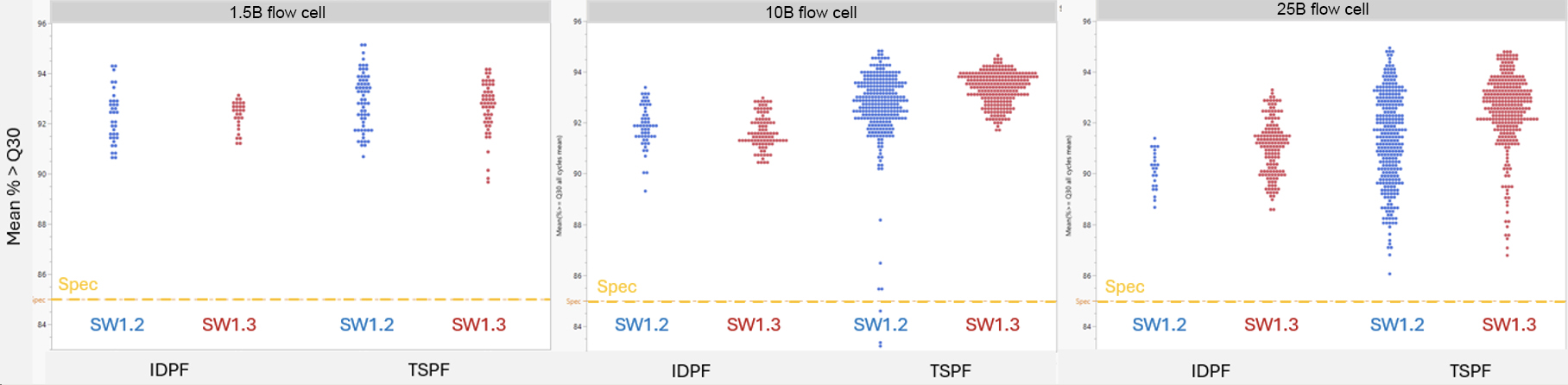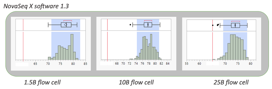 Figure 3: Pass filter distribution for NovaSeq X software update 1.3 for three flow cell types