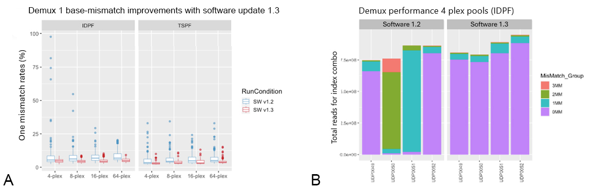 In NovaSeq X software update 1.3, an improvement was made to mitigate that issue: The expected levels of intensity are now adaptively learned and that knowledge is transferred into the base-calling algorithm during index cycles. The resulting improvement is illustrated in Figure 5A, which shows a marked reduction in one mismatch rate, particularly under low-plexity conditions, with NovaSeq X software update 1.3. Additionally, Figure 5B illustrates that index-dependent mismatch rates are significantly improved with the 1.3 software.
