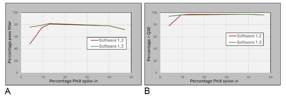 NovaSeq X software update 1.3 offers improved performance for base calling under low-diversity settings, resulting in a much lower requirement for spiked-in PhiX percentage (5%). (Note that for libraries in which the level of diversity may vary significantly from cycle to cycle, the previous guideline of 15% PhiX spike-in still applies.) The performance improvement is shown in Figures 7A and 7B, which indicate that high levels of percentage pass filter and percentage > Q30 data quality can be maintained for low-diversity libraries in NovaSeq X software update 1.3, even at low PhiX spike-in levels.