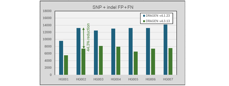 Figure 8: SNP and indel false positive + false negative counts for DRAGEN v4.1.23 and v4.3.13