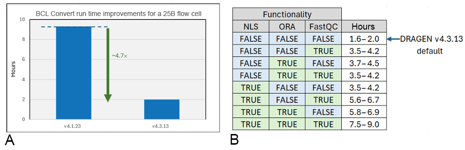 In addition to data quality improvements, BCL Convert has been accelerated when either the on-instrument version or the BaseSpace Sequence Hub application is used. Figure 9A shows a nearly 5× reduction in run time of the newly released on-instrument DRAGEN v4.3.13 compared to DRAGEN v4.1.23. The run-time improvement is achieved by a combination of on-instrument acceleration and more flexible configuration options—for example, no lane splitting (NLS) and FASTQC metric generation, in addition to the previously provided ORA configuration. The configuration options and corresponding run times for a 25B flow cell are shown in Figure 9B.