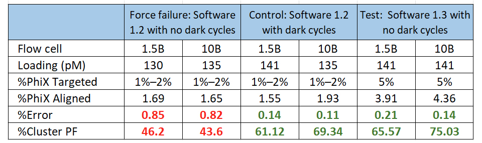 Table 2: Percentage error and percentage cluster passing filter improvements for software 1.3 with no dark cycles