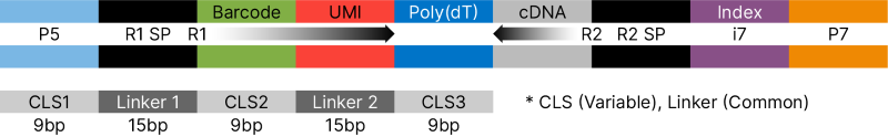 The following image represents the genetic structure for Single Cell RNA Library Kit Type 6. Single Cell RNA Library Kit Type 6 is compatible with the BD Rhapsody Targeted mRNA and AbSeq Amplification, BD Biosciences.